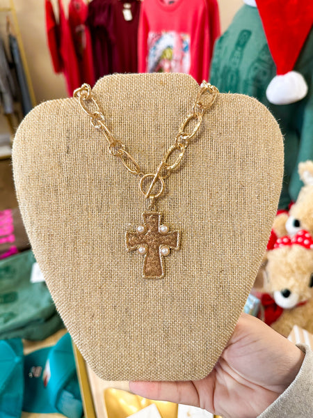 Hammered Cross Pearl Necklace